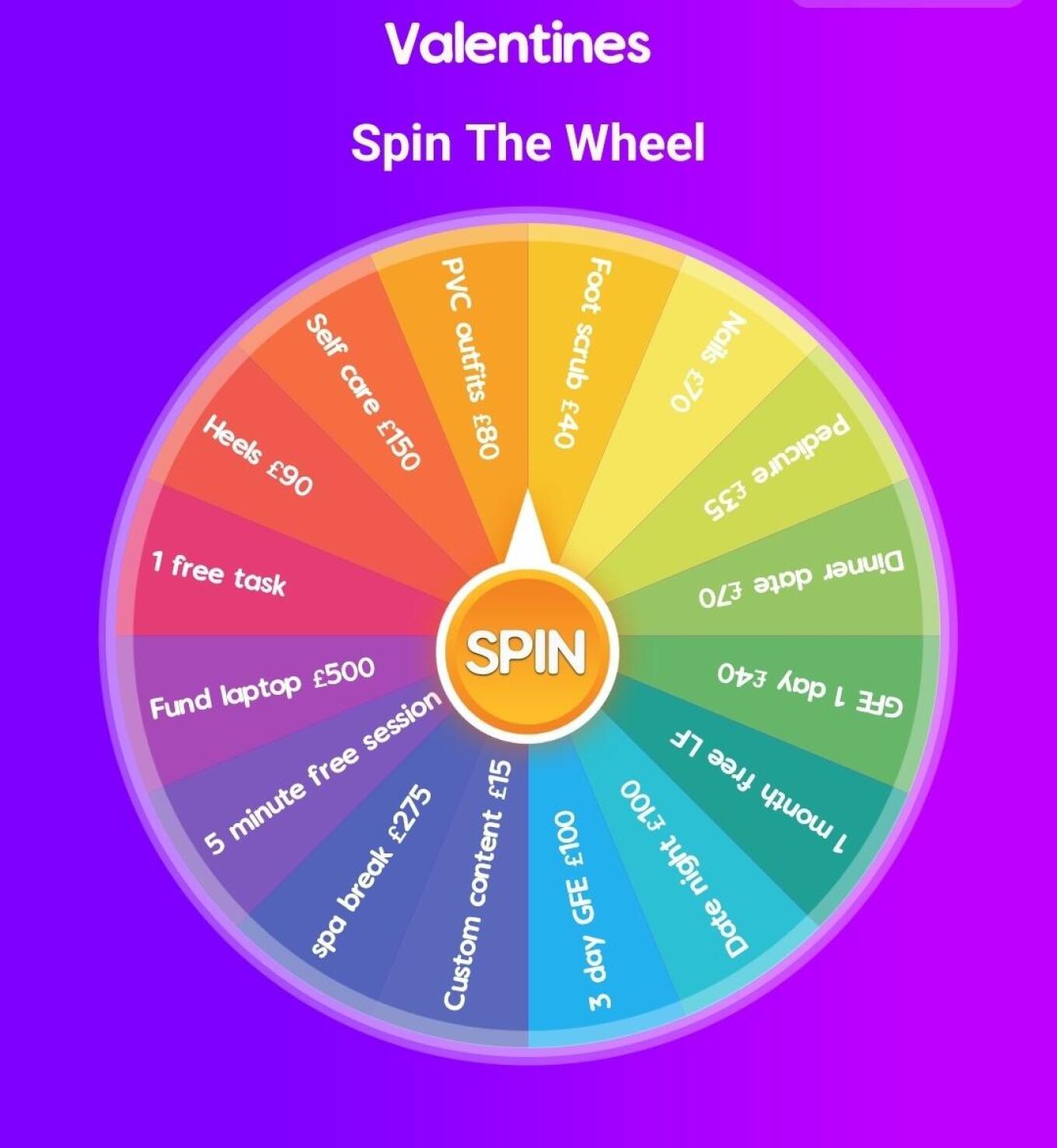Send £10 to spin my Valentines wheel you could either win free sessions/content or you could be funding gifts for Goddess the wheel will