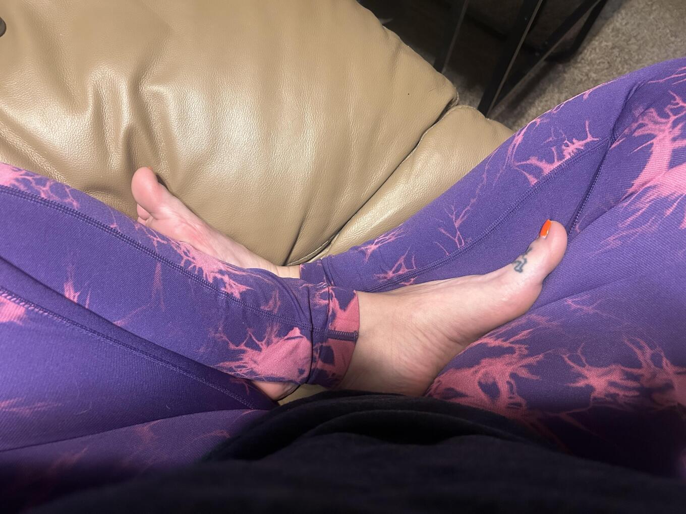 I’m sitting here barefoot, stretched out in my soft purple leggings… calm, grounded, completely at ease. No effort, no posing — just