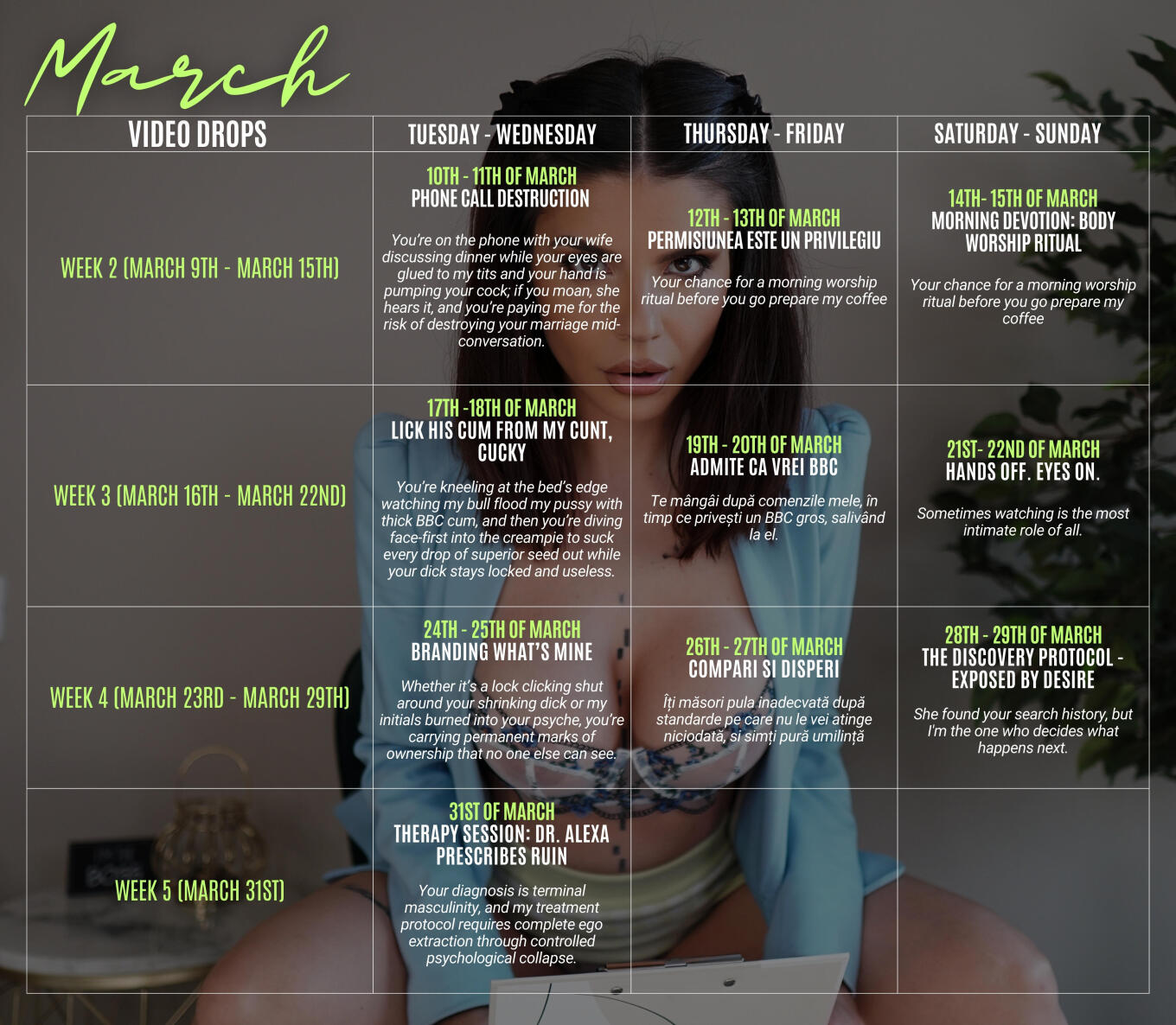Psychological Domination | Mental Conditioning | Financial Domination | Female Supremacy | HomeWrecker | Orgasm Control | Slave Training | Tease and Denial | Goddess Worship | Verbal Humiliation | Gooning | Romanian Femdom Queen | Sensual Domination | Elegant Femdom | Soft Cruelty | The Rewiring
