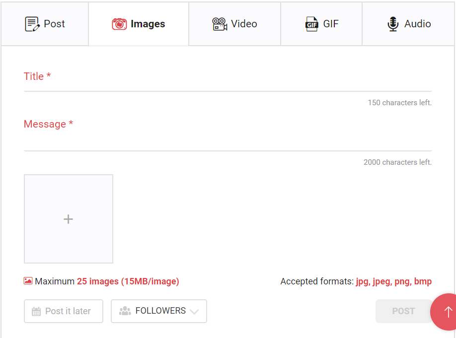 You can post twenty-five (25) images per photo post. Please Note: On your timeline only four (4) images will be displayed with a plus sign and the number of additional images available in the photo post (EX. + 11 more). Accepted file formats: jpg, jpeg, png, bmp. No zip files or compressed files are allowed.
