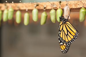 Newborn butterfly and green cocoons