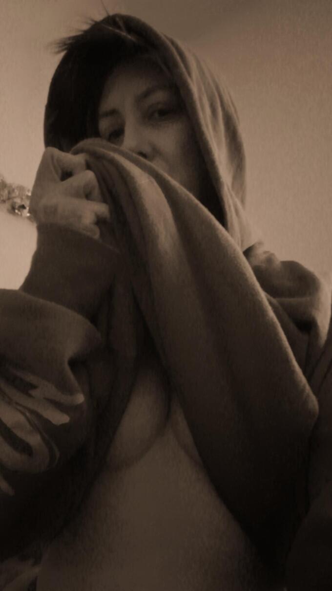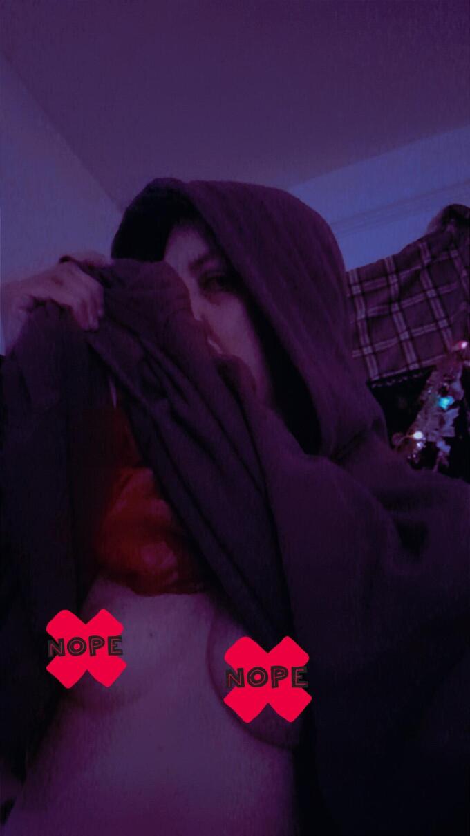 Filtered shot of my chest and stomach. I am wearing a black mesh shirt along with a grey sweater and blue hoodie.