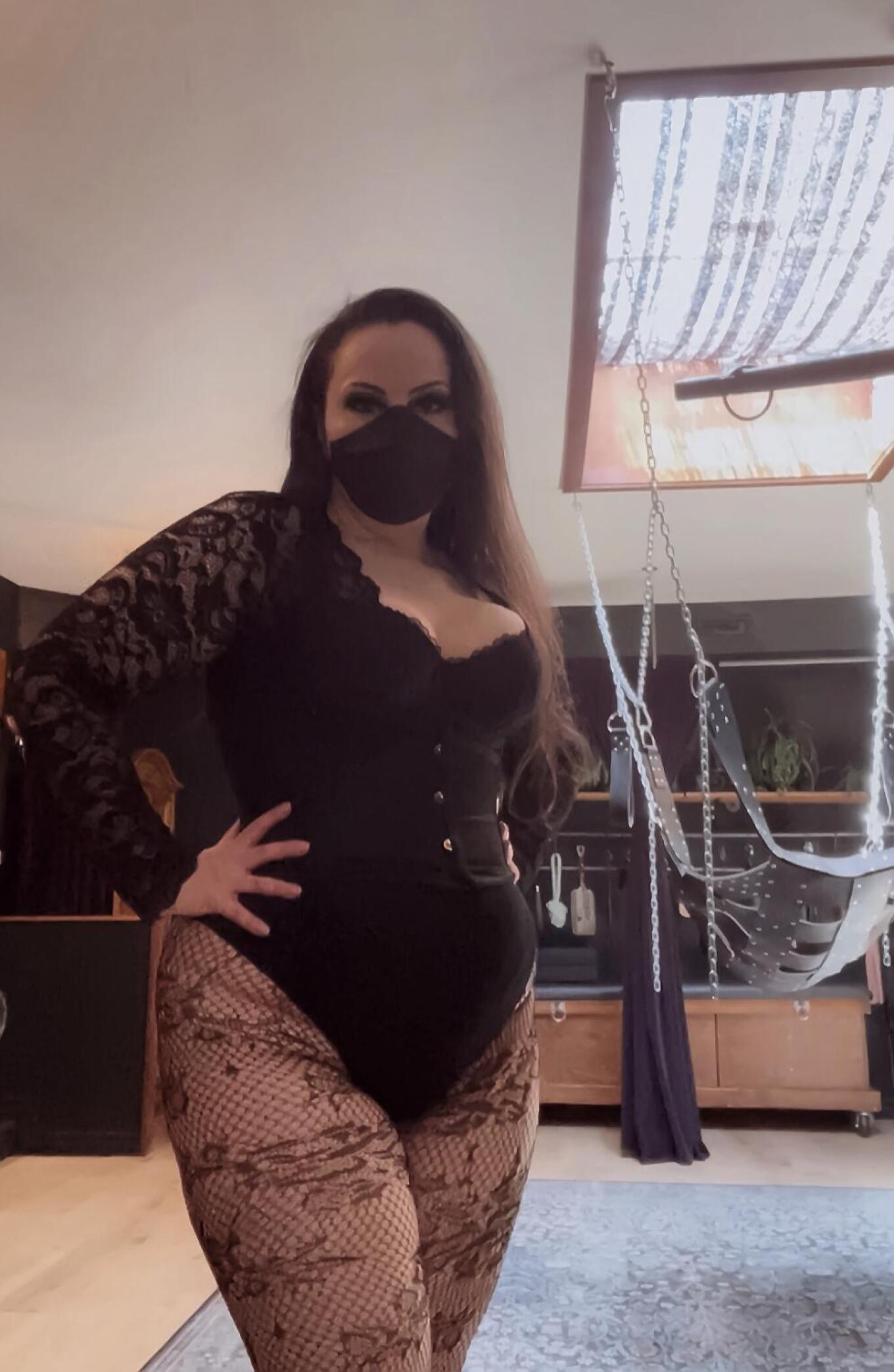 ALT: Domina/Goddess Daidra is pictured inside a Toronto BDSM dungeon in all black and lace. She's wearing a mask, body suit, corset,