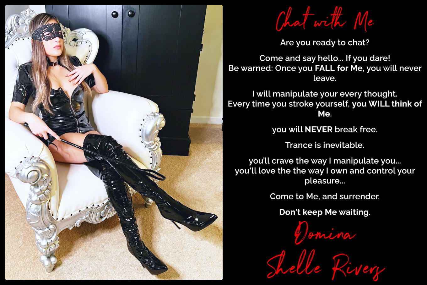 The place to submit to Me. You will love surrendering to My Erotic Trances. I discovered My desire and ability to control those around Me in my early adulthood. Erotic Brainwashing has allowed Me to take My Power & Control to the next level. You will be Mine, and I will guide you wherever I choose.