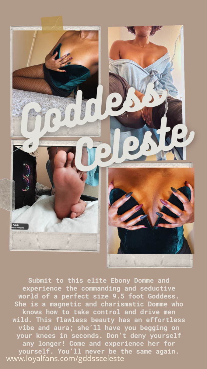 Why hello there! I'm Goddess Celeste, psychology & mythology obsessed gamer with a God complex. This fan page centers on non-nude findom, foot fetish , thigh crushing, legs, giantess clips and photo content!
