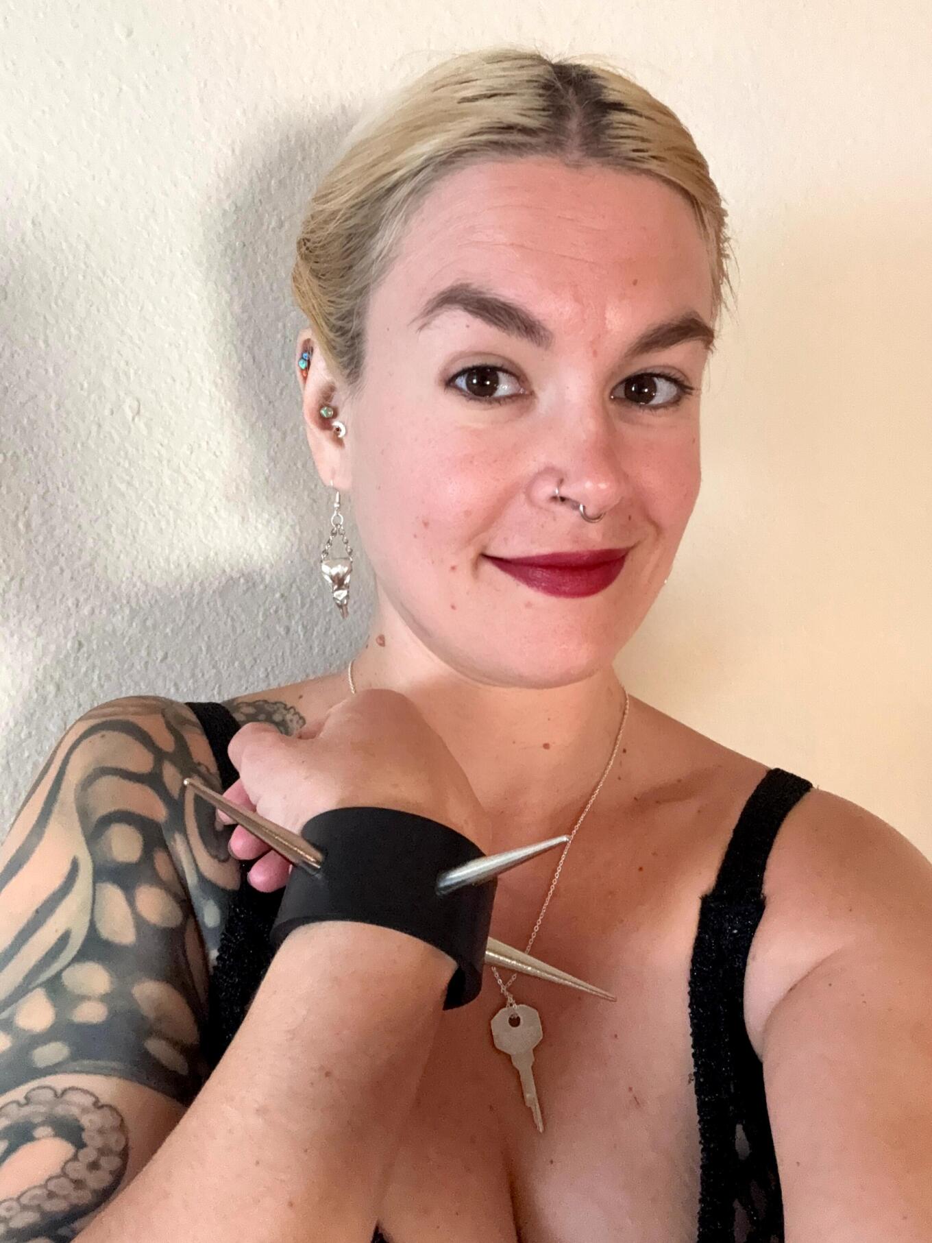 I sit beside you, leaning over your bound, prone body in my fishnet dress and corset. Your key is hanging around my neck. Why am I smiling?