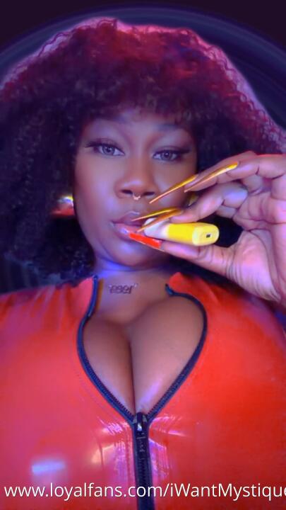 I tower over you clad in skin-tight red latex, my massive Ebony tits straining against the shiny rubber, ready to spill out and destroy