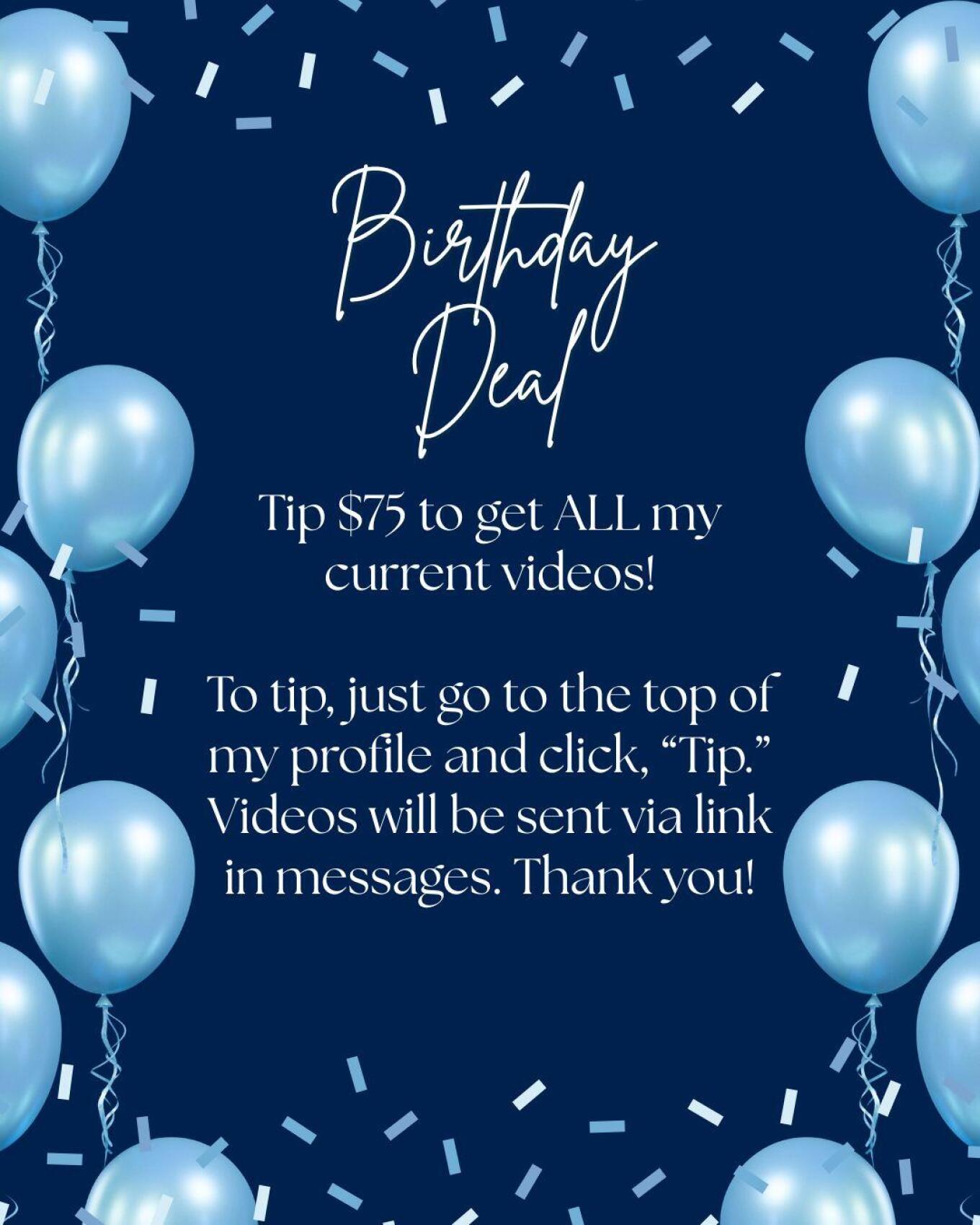 Tip just $75 to get ALL my current videos! To tip, just go to the top of my profile and click, "Tip." Videos will be sent via link in