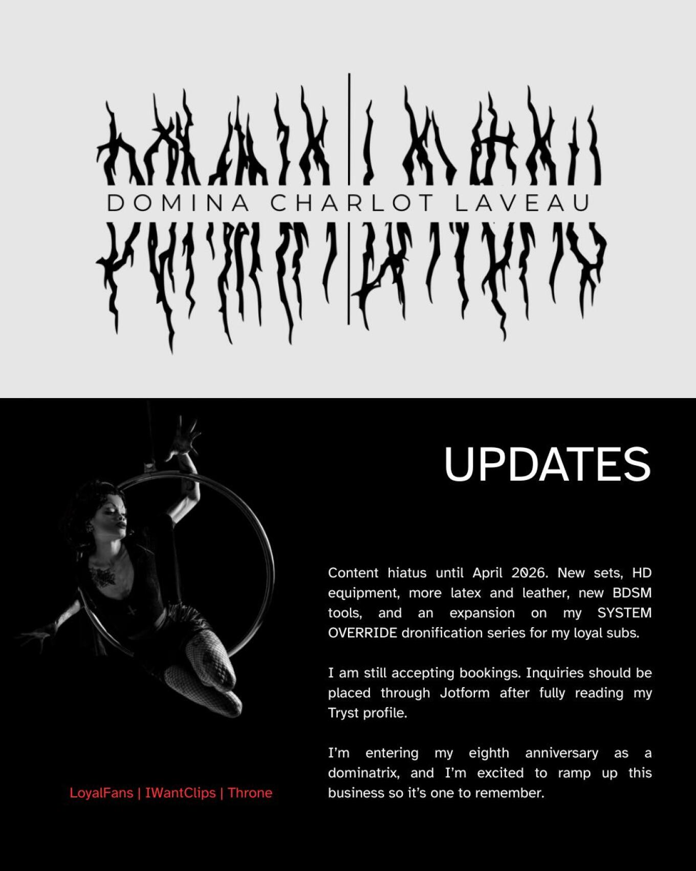 I’m entering my eighth anniversary as a dominatrix, and I’m excited to ramp up this business so it’s one to remember.