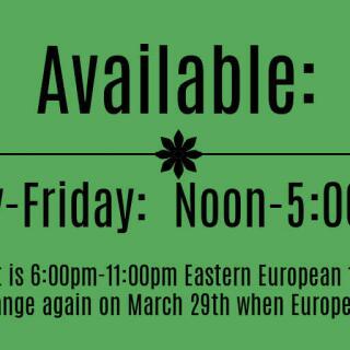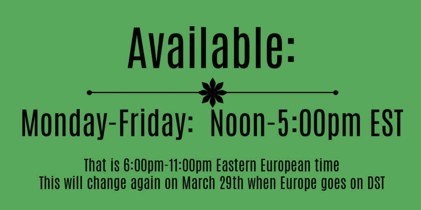Now that I am back in Romania and somewhat settled I can offer more predictable hours for engagement. I will be available for chat, video,
