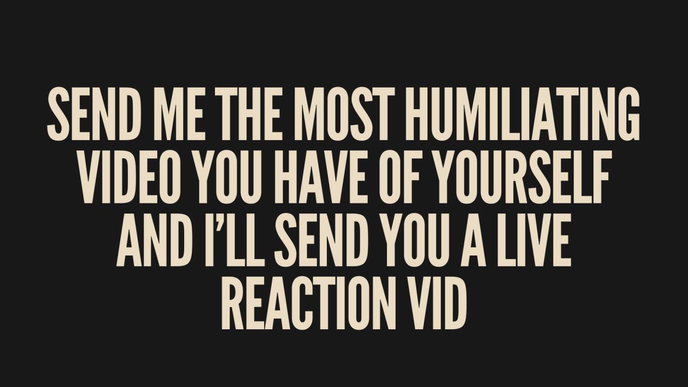 Sending out more reaction vids today! Send me the most HUMILIATING video you have of yourself and I'll send you a live reaction vid! (or)