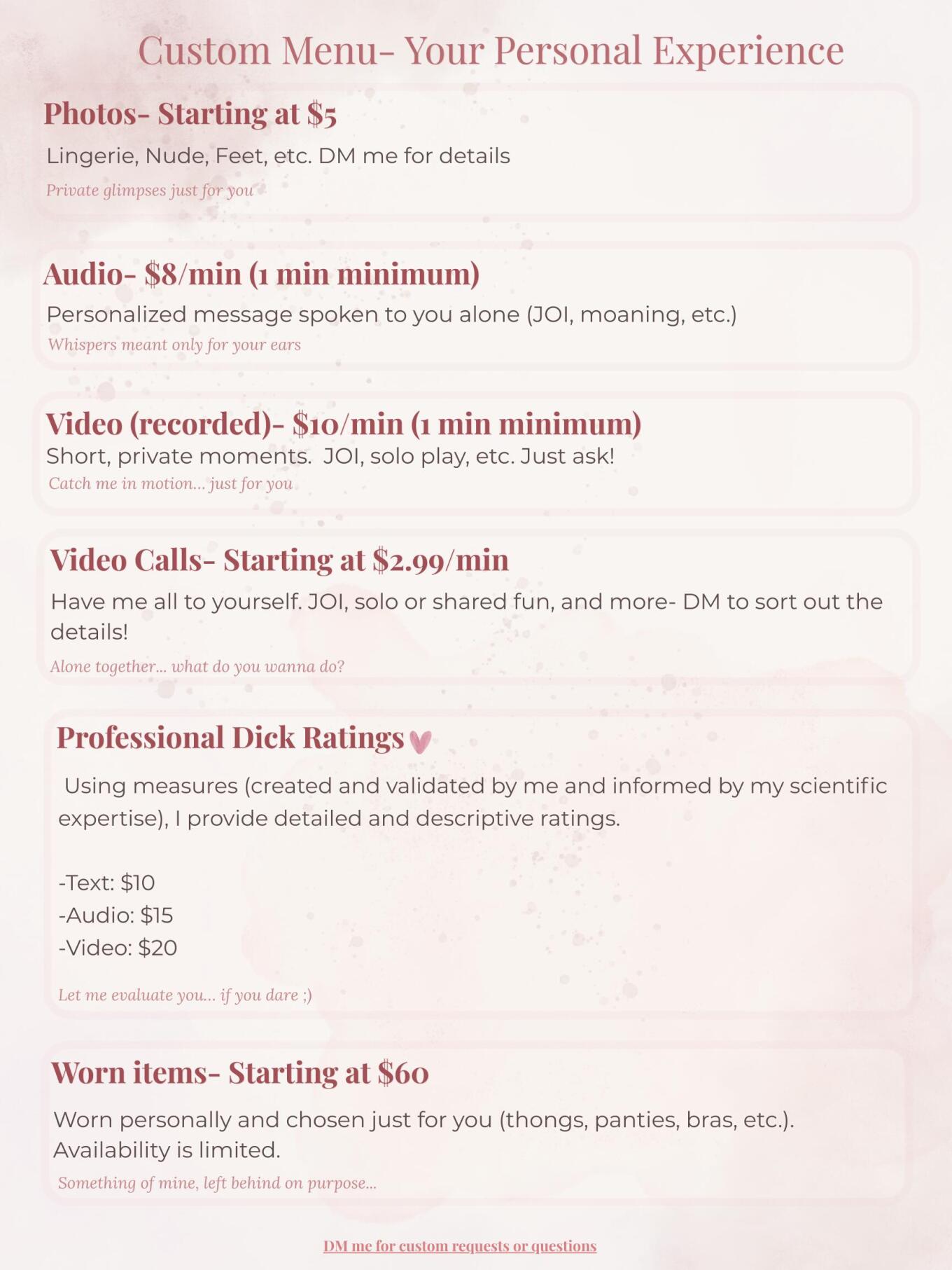 Custom content and rare items are available for those who want something personal. I like to tailor all my content to you, but I especially enjoy video calls and custom video/audio. Check my menu, or ask if you don’t see what you’re looking for.