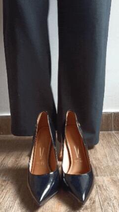 I stand tall in black formal pants as I slowly slip into my black stilettos.