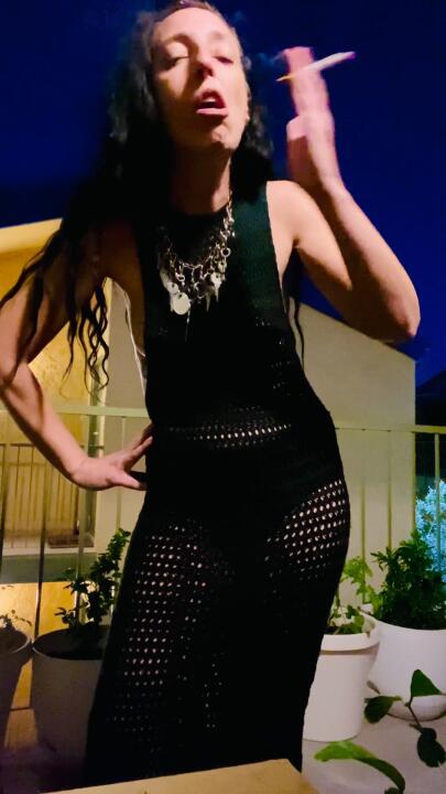 Wholesome Domme smokes a cigarette while wearing a black loose knit dress and very special panties that she just HAS to show off as well as